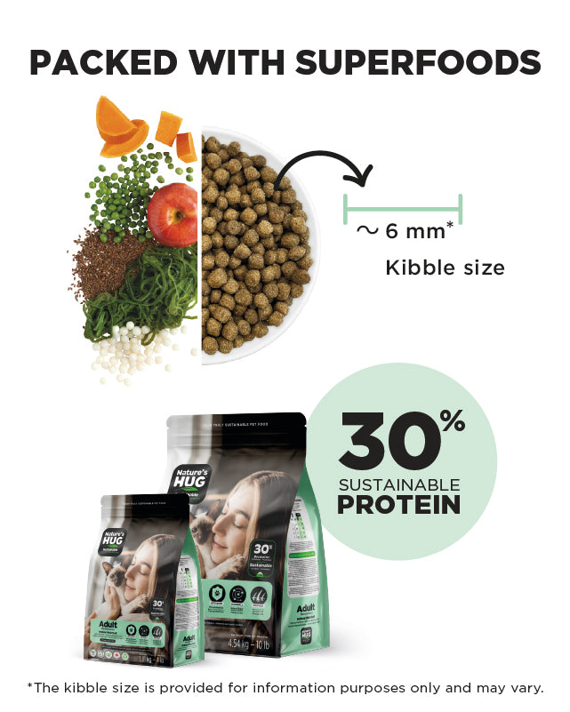 Nature’s HUG Adult Hairball is specially formulated to reduce hairball formation and support overall well-being. It features sustainable, hypoallergenic high-quality plant-based proteins that provide the same essential amino acids as chicken. The formula includes SRT™ technology with prebiotics, probiotics, and postbiotics to promote a healthy gut and immune system.