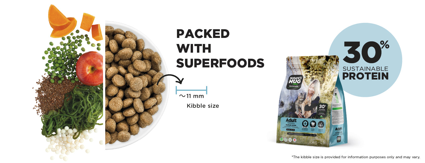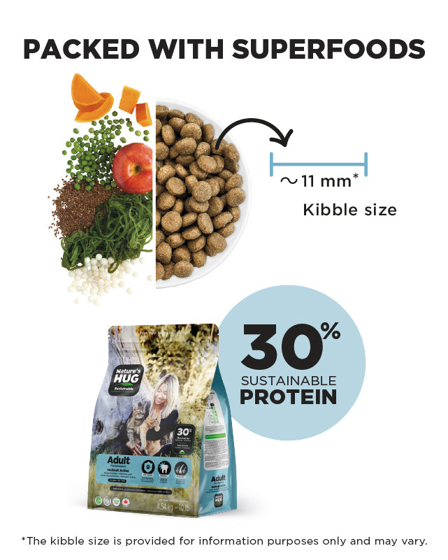 Nature’s HUG Adult Multicat Active formula is specially formulated to maintain energy, lean muscle, immunity, and healthy skin/coat in active cats. It features sustainable, hypoallergenic high-quality plant-based proteins that provide the same essential amino acids as chicken. The formula includes SRT™ technology with prebiotics, probiotics, and postbiotics to promote a healthy gut and immune system.