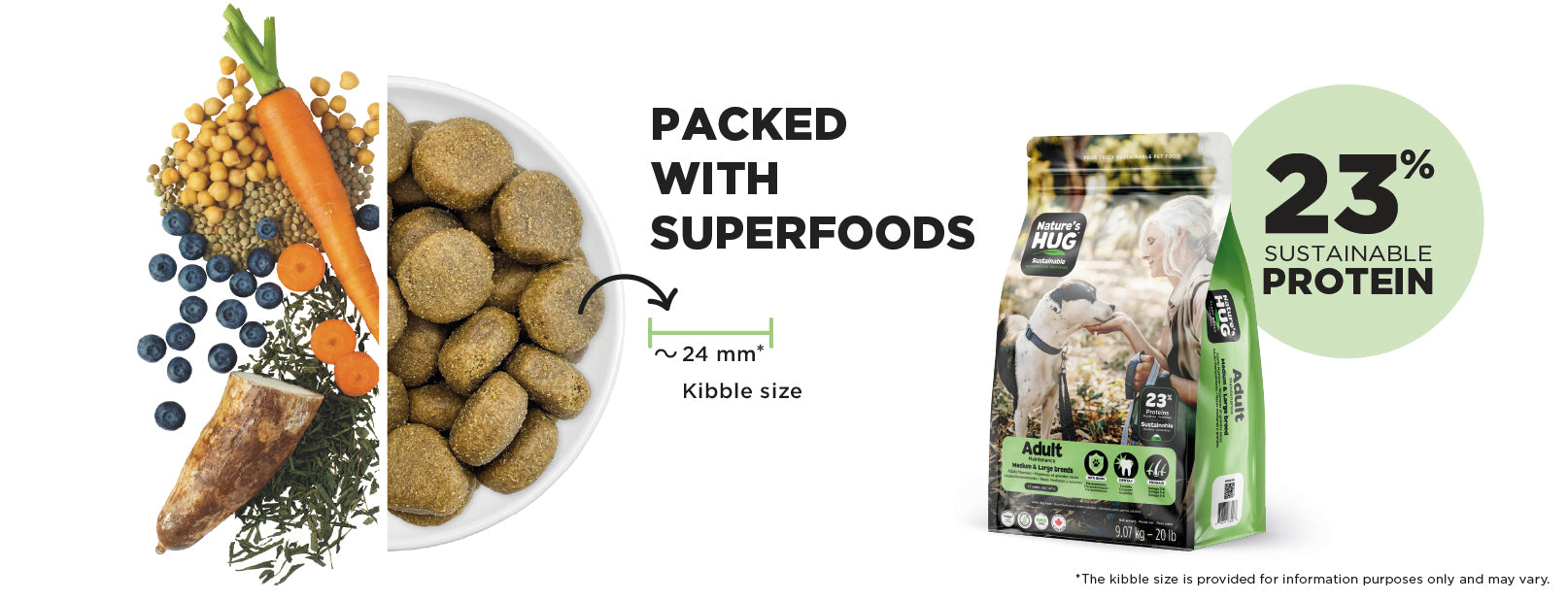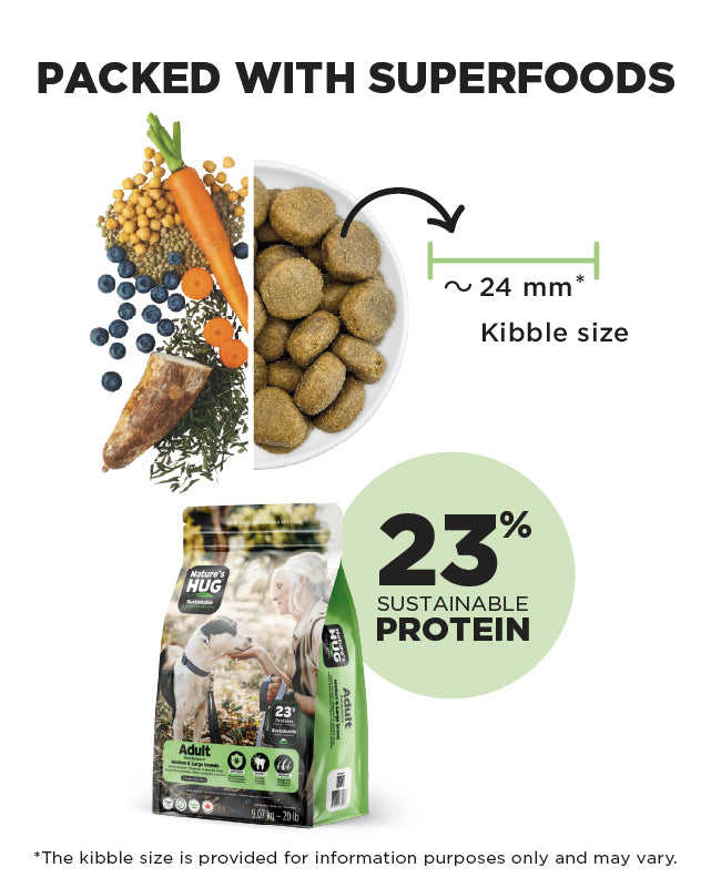 Nature’s HUG Adult Medium & Large Breeds Dry Food is specially formulated to support healthy growth and development. It features sustainable, hypoallergenic high-quality plant-based proteins that provide the same essential amino acids as chicken. The formula includes SRT™ technology with prebiotics, probiotics, and postbiotics to promote a healthy gut and immune system.