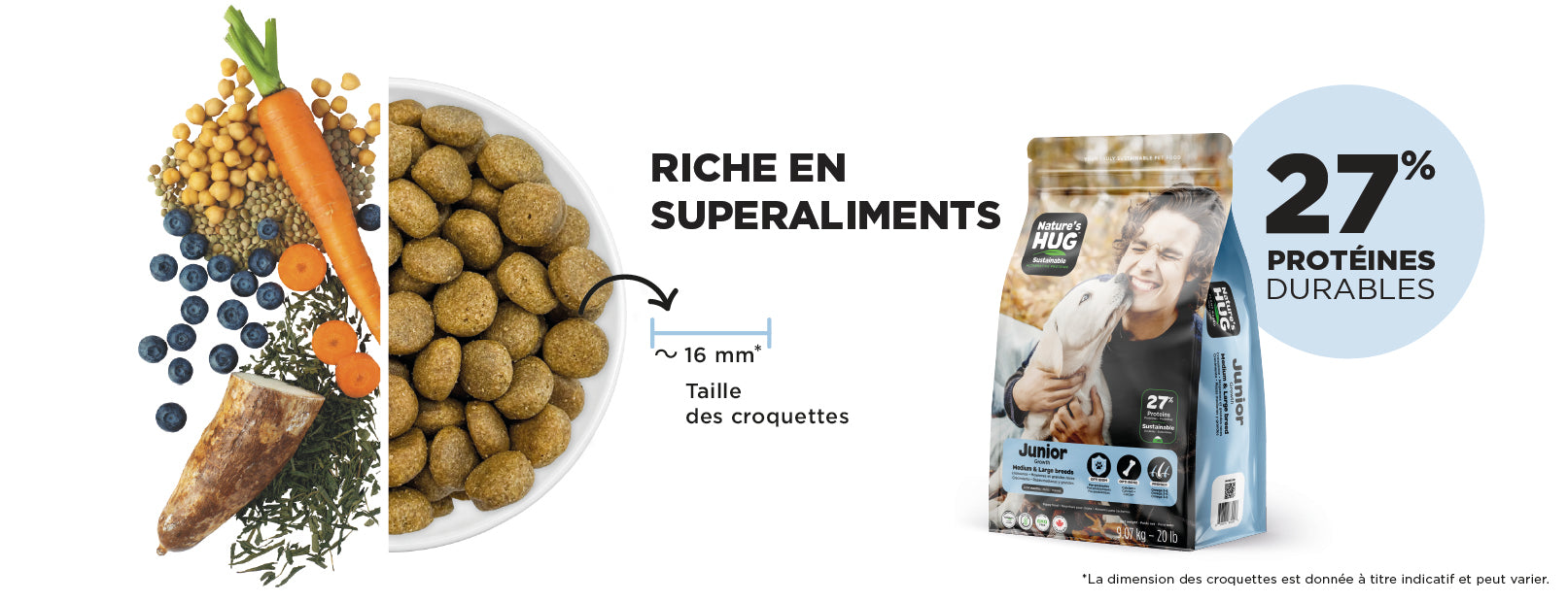 La formule Nature’s HUG nourriture sèche Junior Moyennes et Grandes Races est spécialement formulée pour soutenir une croissance et un développement sains pendant la première année de votre chiot elle contient des protéines végétales hypoallergéniques de haute qualité et durables qui fournissent les mêmes acides aminés essentiels que le poulet. La formule intègre la technologie SRT™ avec prébiotiques probiotiques et postbiotiques pour favoriser un système digestif et immunitaire sain.