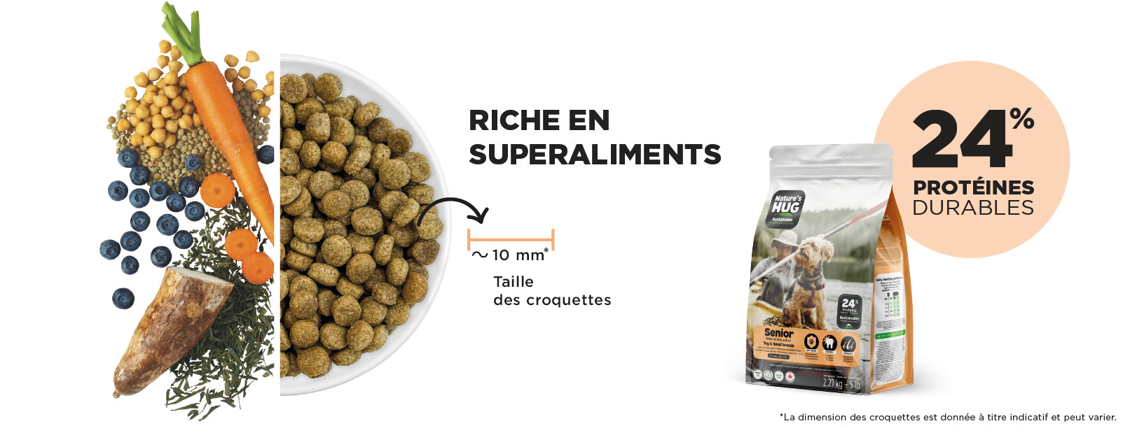 La formule Nature’s HUG nourriture sèche Senior, Âgés ou Moins Actifs est spécialement formulé pour soutenir la santé et la vitalité des chats senior conçu avec des protéines végétales hypoallergéniques durables et de haute qualité qui fournissent les acides aminés essentiels pour aider à maintenir la force musculaire. La formule intègre la technologie SRT™ avec prébiotiques probiotiques et postbiotiques afin de favoriser un système digestif et immunitaire sain.