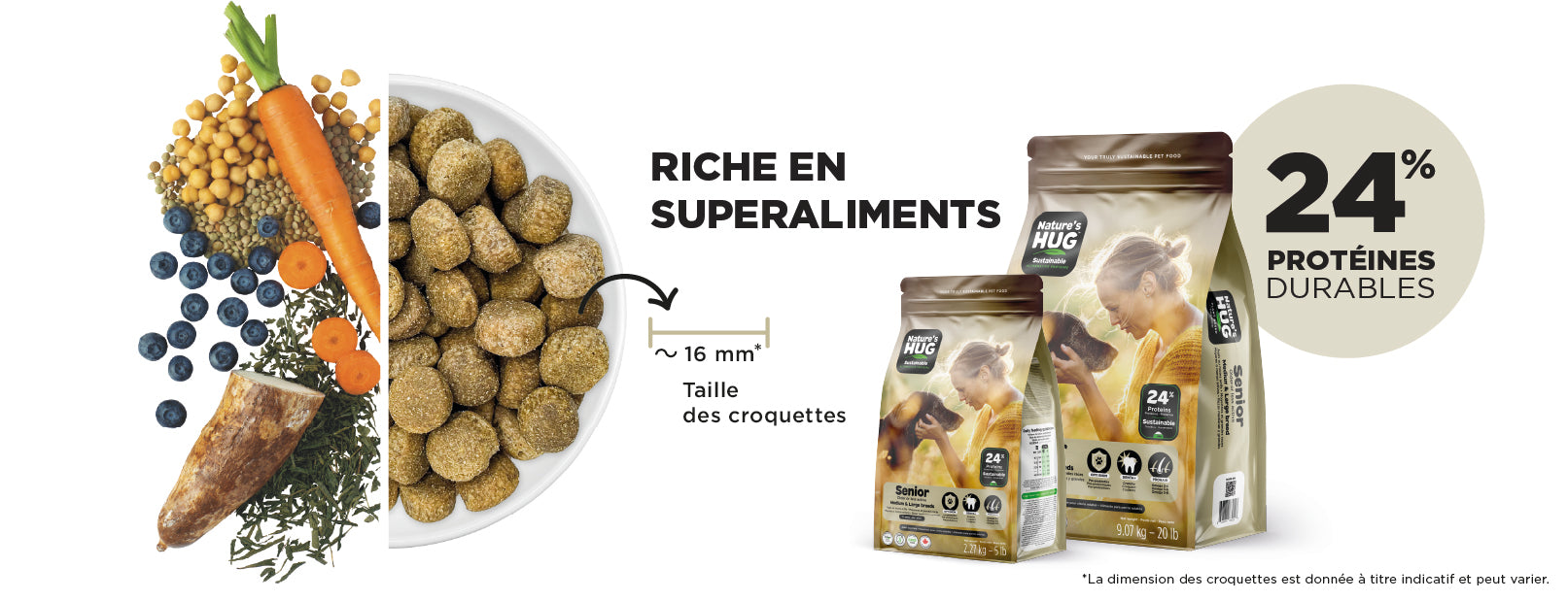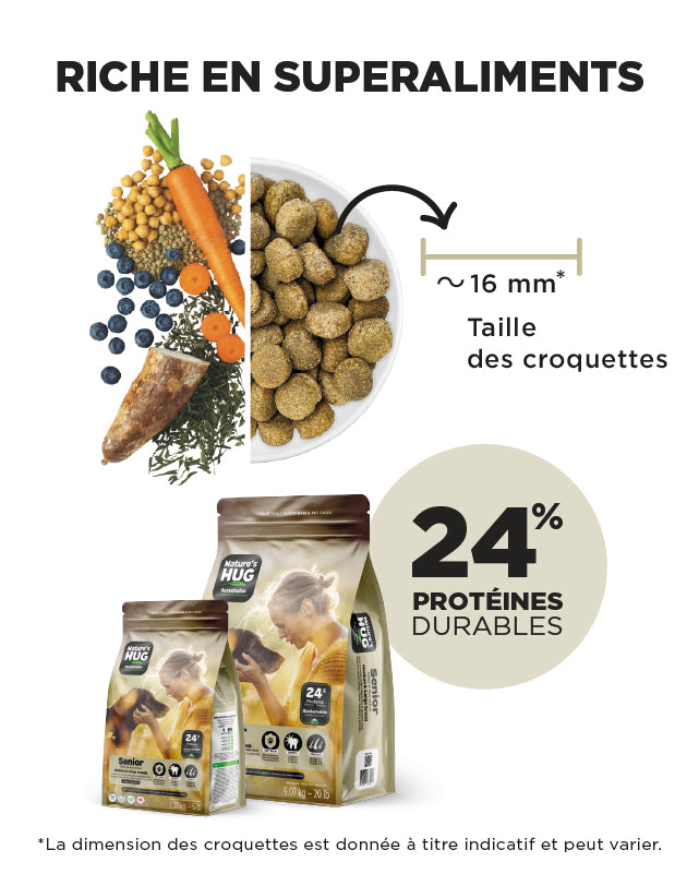 La formule Nature’s HUG nourriture sèche Senior Moyennes et Grandes Races est spécialement formulée pour soutenir la santé et la vitalité des chiens vieillissants elle contient des protéines végétales hypoallergéniques de haute qualité et durables qui fournissent les mêmes acides aminés essentiels que le poulet. La formule intègre la technologie SRT™ avec prébiotiques probiotiques et postbiotiques pour favoriser un système digestif et immunitaire sain.