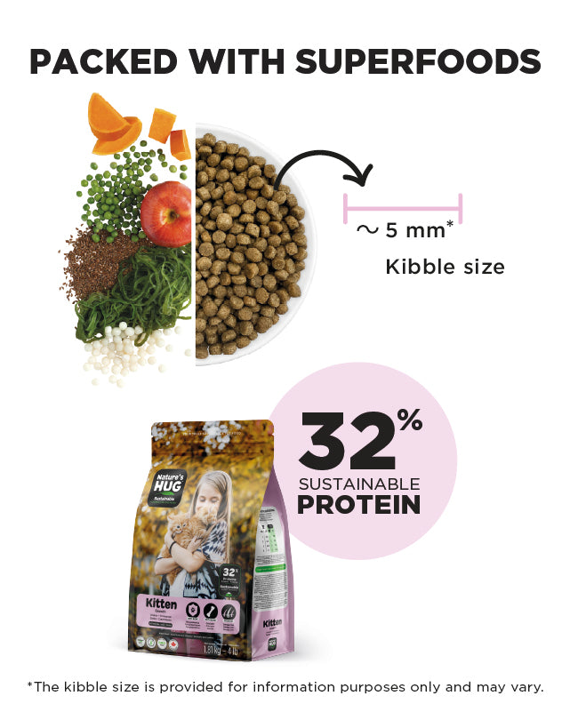 Nature’s HUG Kitten Dry Food is specially formulated to support healthy growth and development during your kitten’s first year. It features sustainable, hypoallergenic high-quality plant-based proteins that provide the same essential amino acids as chicken. The formula includes SRT™ technology with prebiotics, probiotics, and postbiotics to promote a healthy gut and immune system.