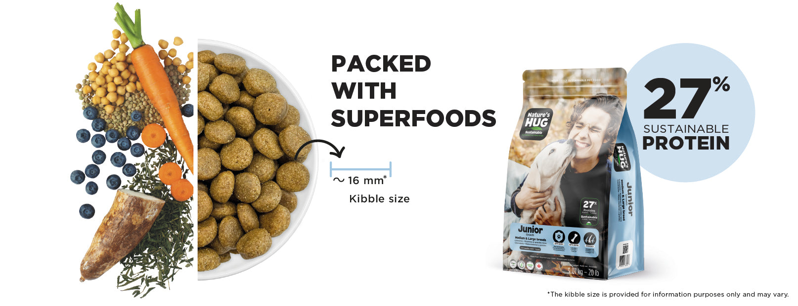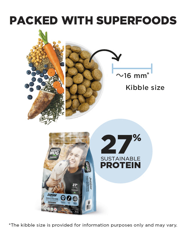 Nature’s HUG Junior Medium & Large Breeds Dry Food is specially formulated to support healthy growth and development during your puppy’s first year. It features sustainable, hypoallergenic high-quality plant-based proteins that provide the same essential amino acids as chicken. The formula includes SRT™ technology with prebiotics, probiotics, and postbiotics to promote a healthy gut and immune system.
